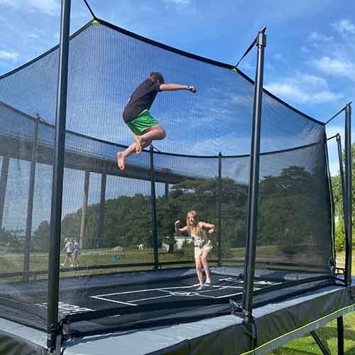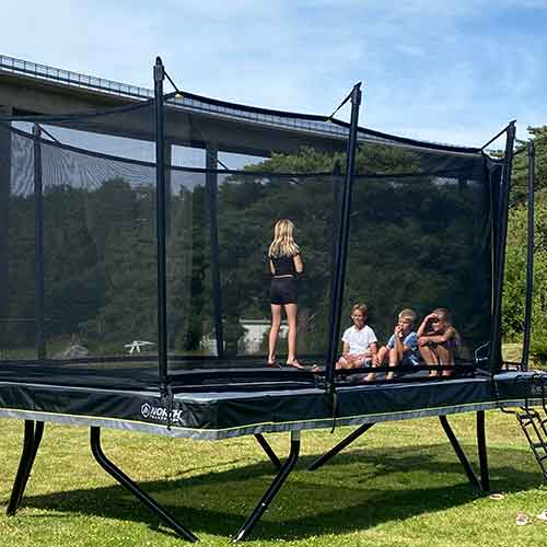 A rectangular trampoline provides a larger and more dynamic jumping zone than a round trampoline. You’ll enjoy an even, secure bounce without being pulled toward the centre, and wherever you land you get the same high, powerful lift. The result is a professional feel, multiple jump zones, and maximum performance—perfect for large families or adventure-seeking kids!